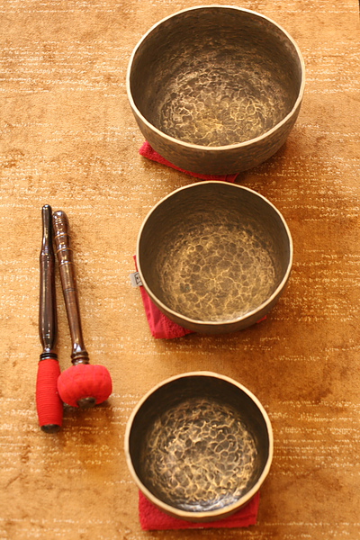 這是我新買的缽,當初有兩組缽可以讓我選,不是二選一,而是大中小各兩個讓我任意配,選了這組覺得聲音很和諧,回家才發現我選了完全五度跟大三度的音程,當然和諧的不得了,可能是這幾年聽太多極度不和諧的聲音,所以讓我覺得這組缽真是太棒了!